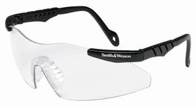Magnum 3G safety glasses Clear lenses Black frame Polycarbonate lenses Ergonomically dimensioned 3-point fit Built-in hinge-stops help eliminate scratches Self-adjusting, ergonomic rubber nose pad with rubber fingers Meet ANSI Z87.1+ impact standard 99.9% UV protection S&W logo on frame